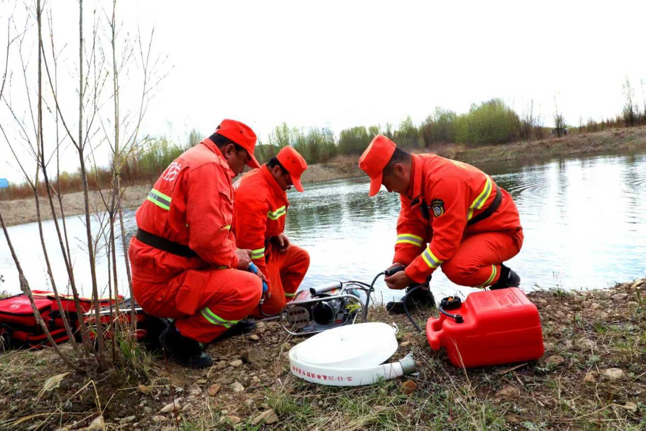 阿木爾林業(yè)局專業(yè)撲火隊員利用便攜式水泵在水源旁取水(王力 攝)