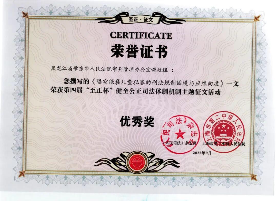黑龍江經(jīng)濟網(wǎng)訊(董慧瑩 王岳)近日,由《人民司法》雜志社與上海市第二中級人民法院聯(lián)合舉辦的第四屆“至正杯”健全公正司法體制機制征文活動結果揭曉。本屆征文共收到投稿1500余篇,經(jīng)評委會認真評議,共評選出一等獎5篇、二等獎15篇、三等獎50篇、優(yōu)秀獎60篇。其中,肇東市人民法院審管辦(研究室)課題組撰寫的調(diào)研論文《隔空猥褻兒童犯罪的刑法規(guī)制困境與應然向度》榮獲優(yōu)秀獎。